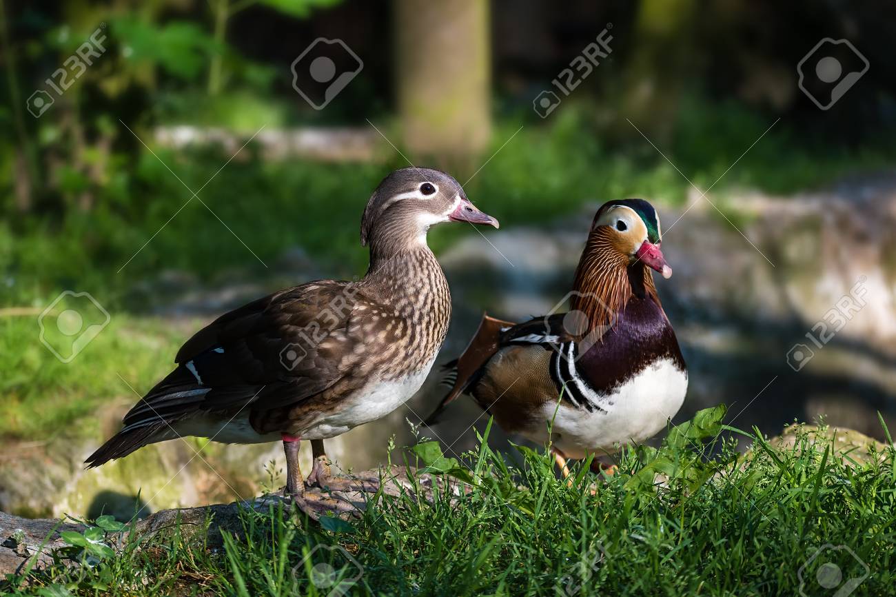 Pair Of Mandarin Ducks Aix Galericulata In The Green Grass A Closeup Stock Photo Picture And Royalty Free Image Image 91099450